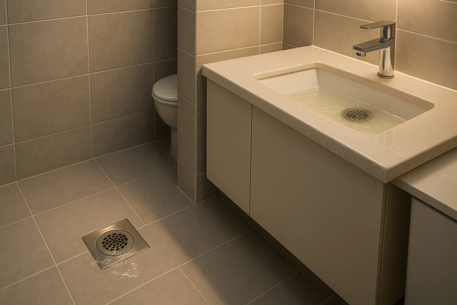 • 화장실 세면대나 샤워 배수구에서 물이 빠져야 할 타이밍에 역류하거나 맺혀 있다